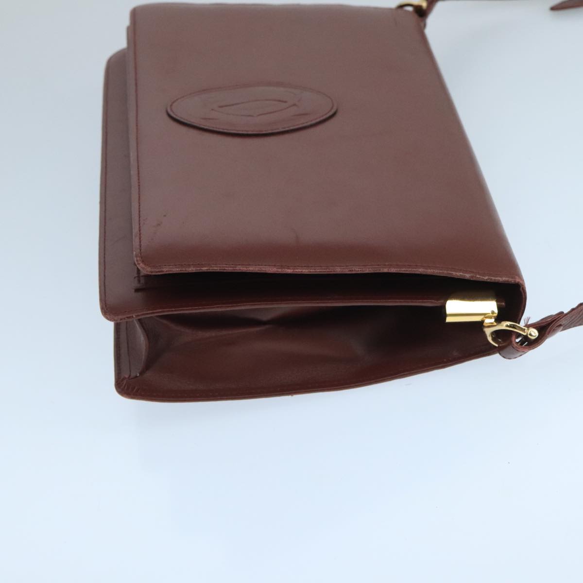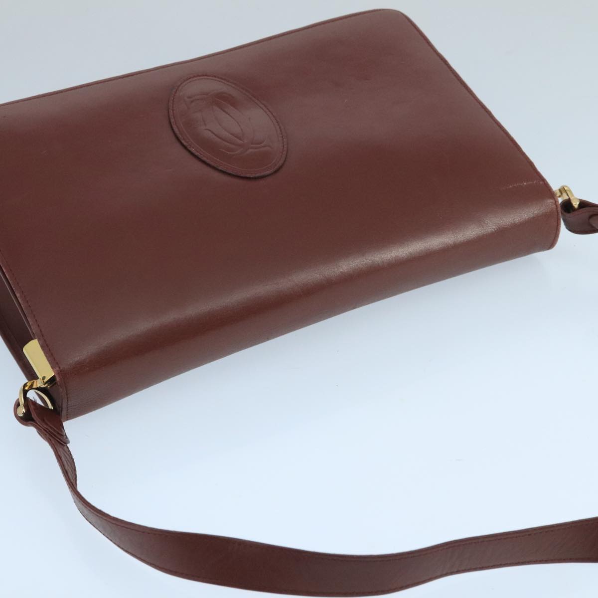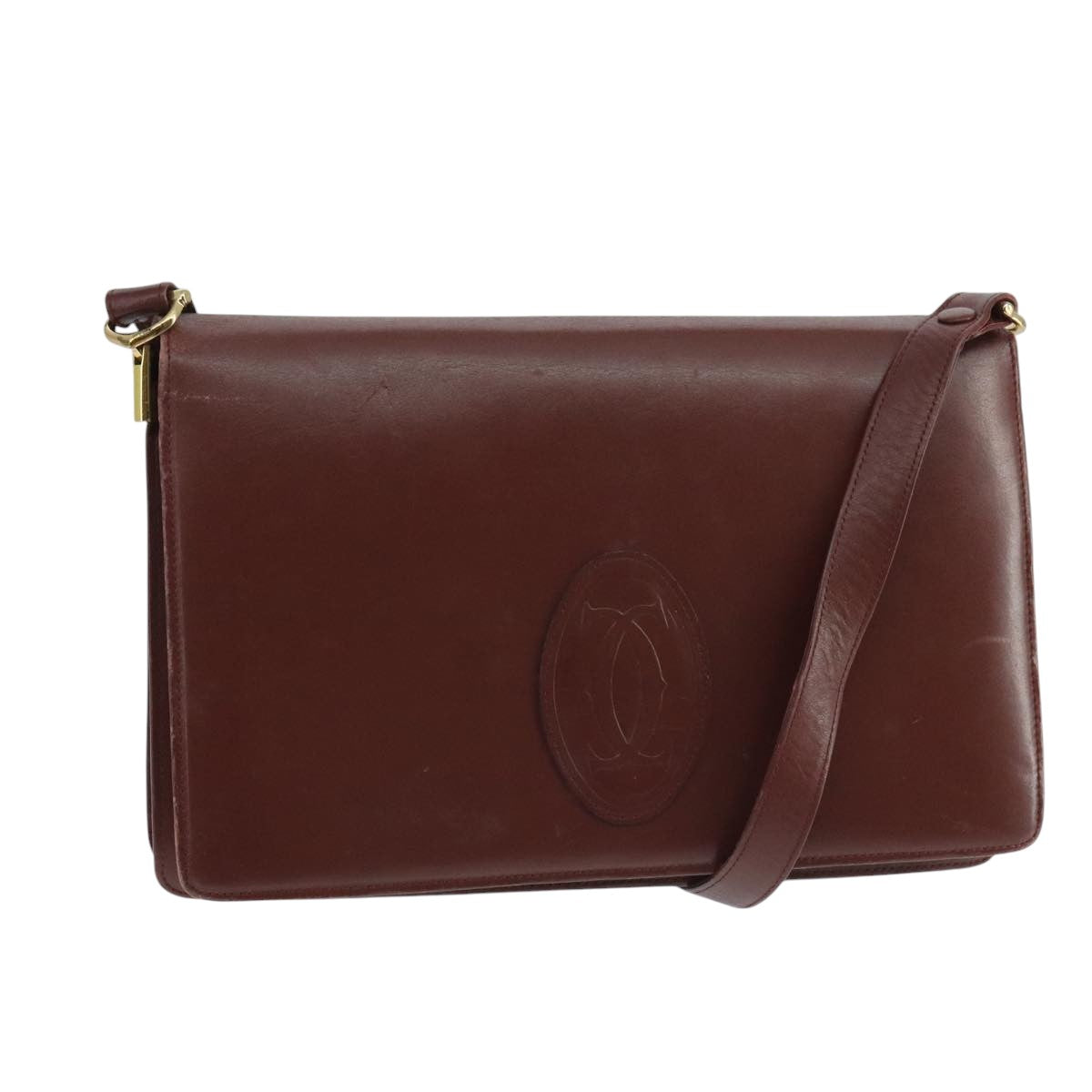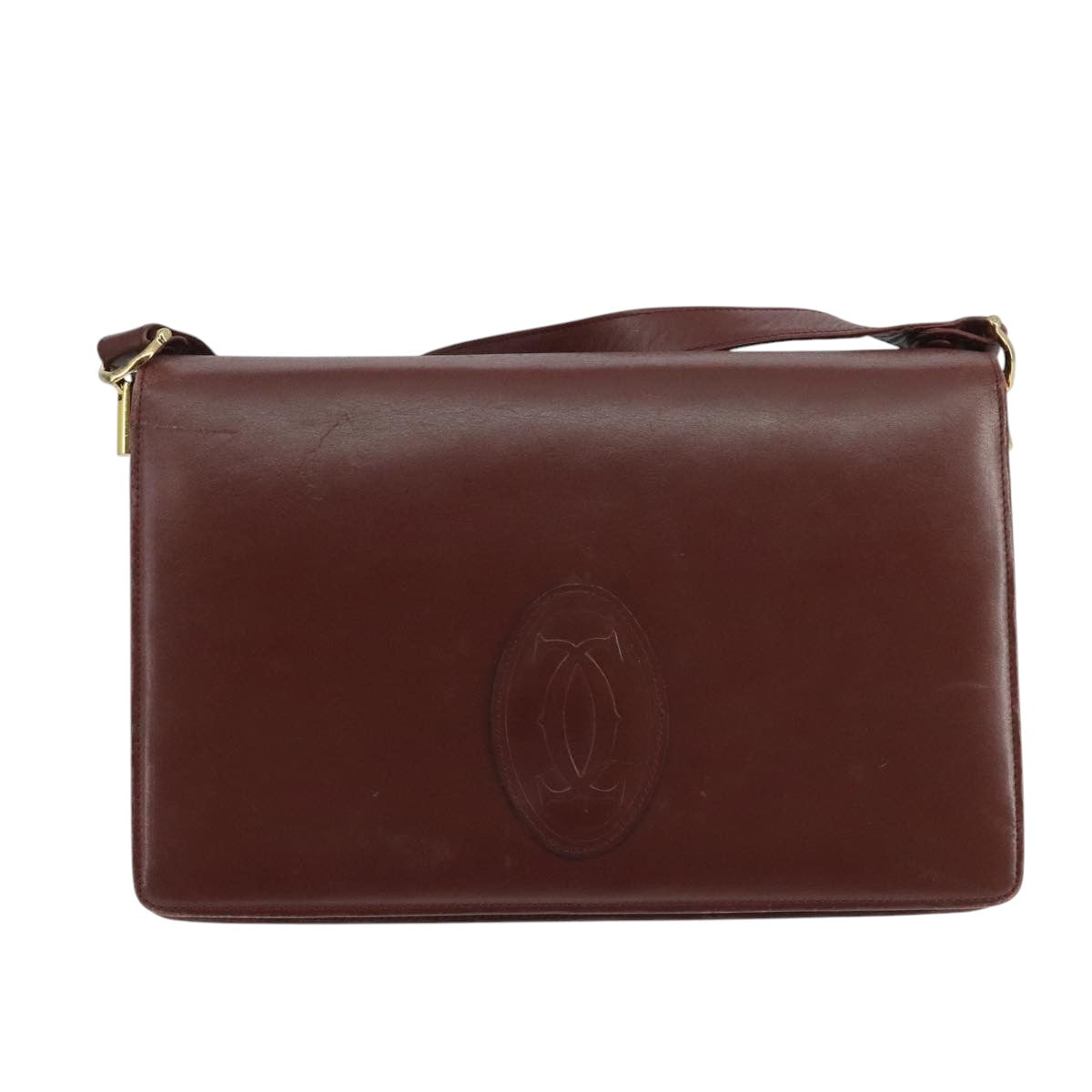 CARTIER Shoulder Bag Leather Bordeaux Gold Auth mr785