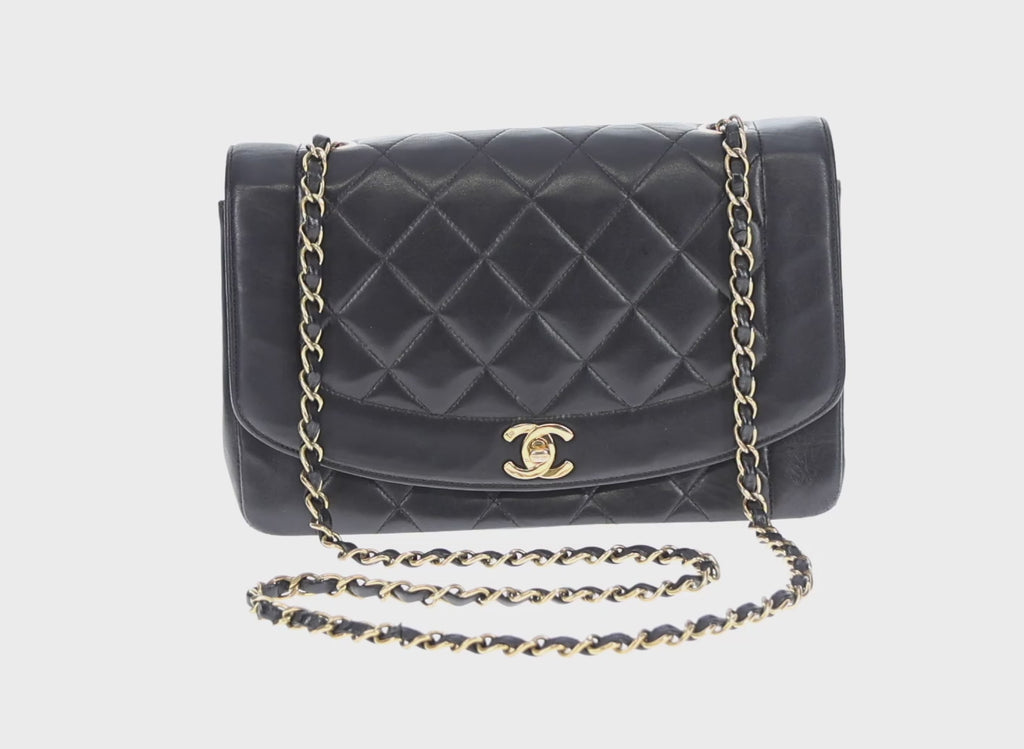 CHANEL Matelasse Chain Diana Shoulder Bag Lamb Skin Black Gold CC Auth 147913V