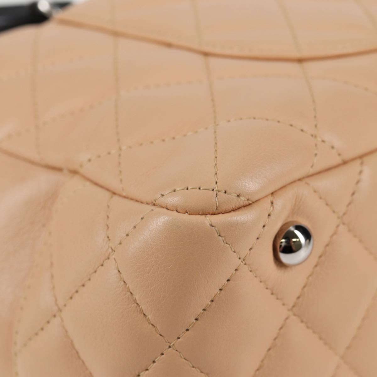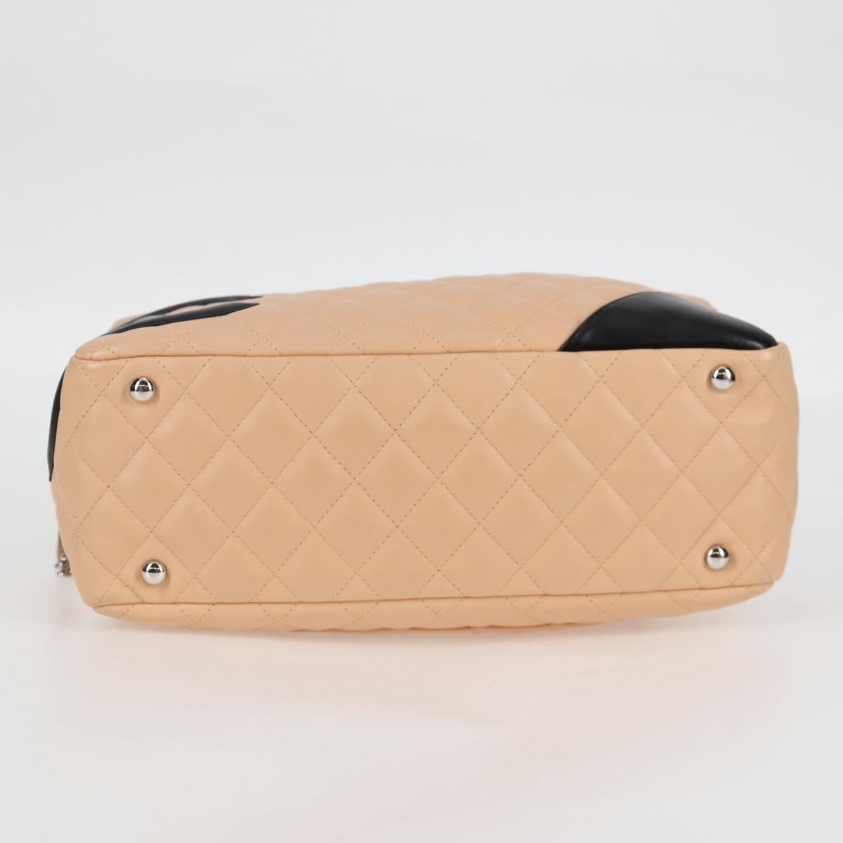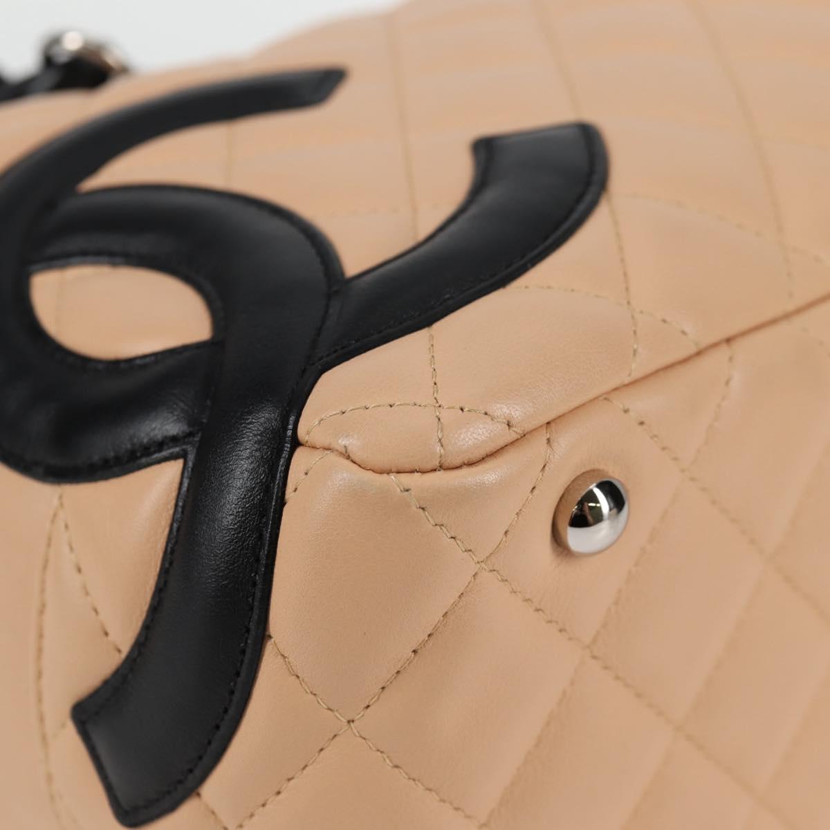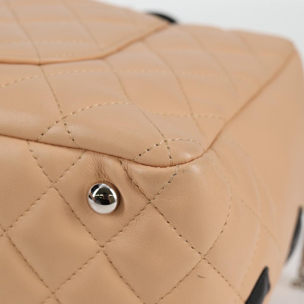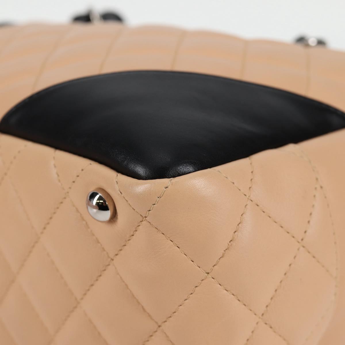 CHANEL Cambon Boston 2004 Tote Bag Beige Black Silver Lambskin