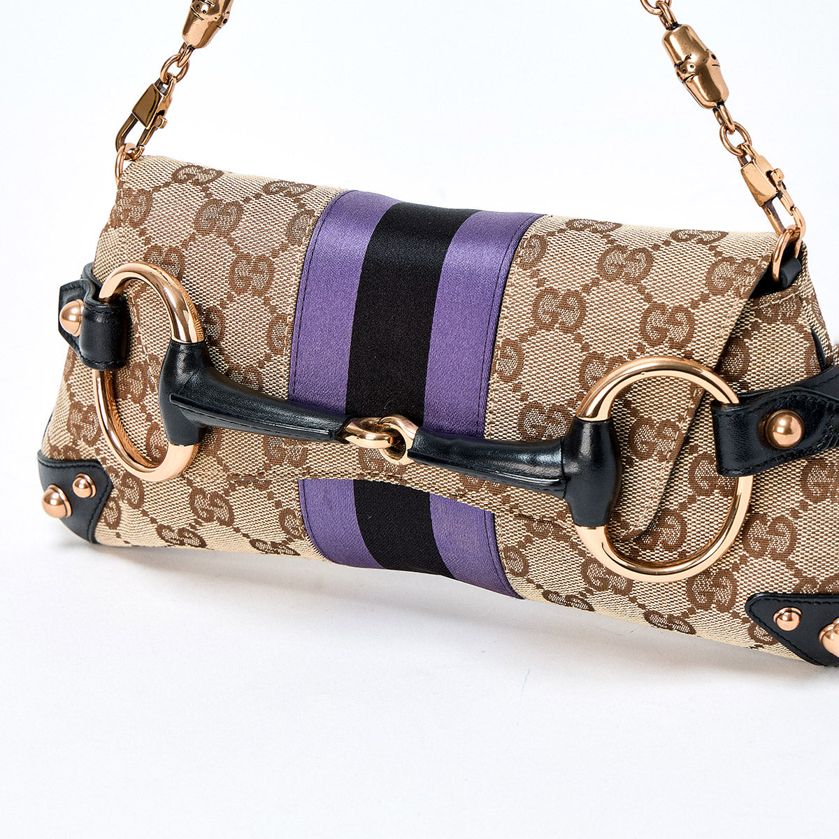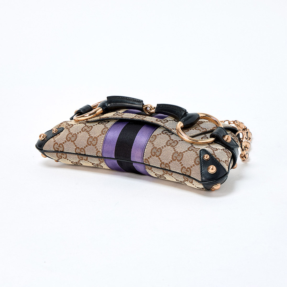 GUCCI Horsebit Shoulder Bag Beige Purple Black Gold Canvas Auth