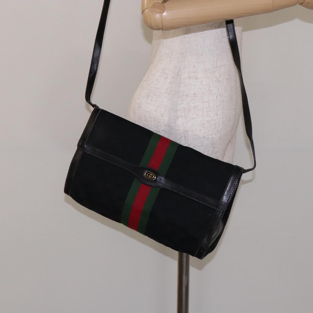 GUCCI Web Sherry Line GG Canvas Shoulder Bag Black Gold 37 04 3657 Auth 133392
