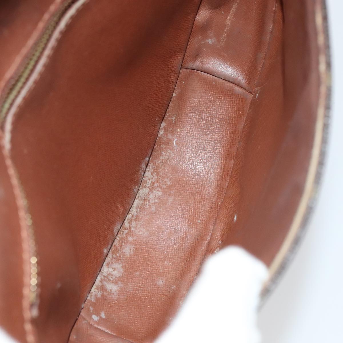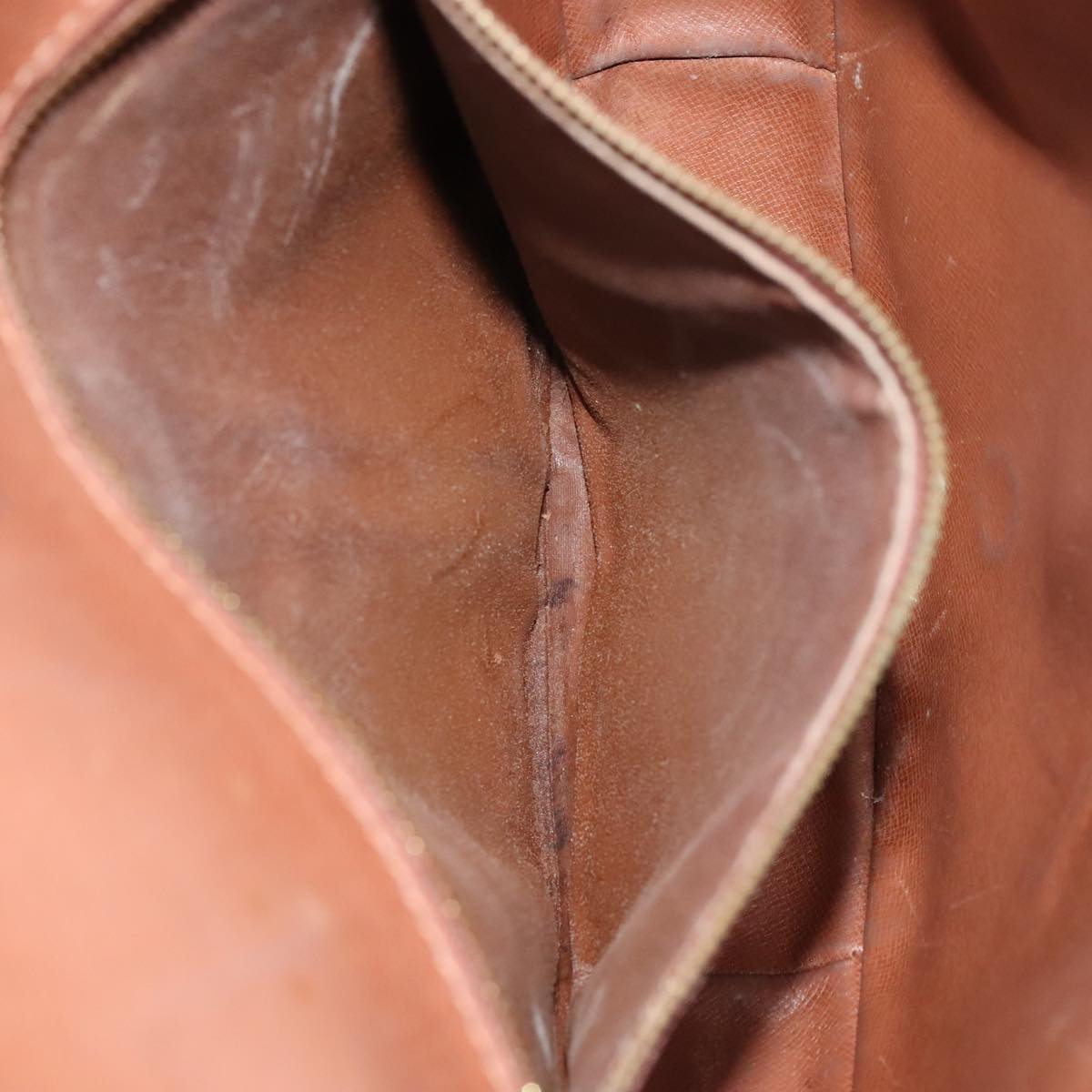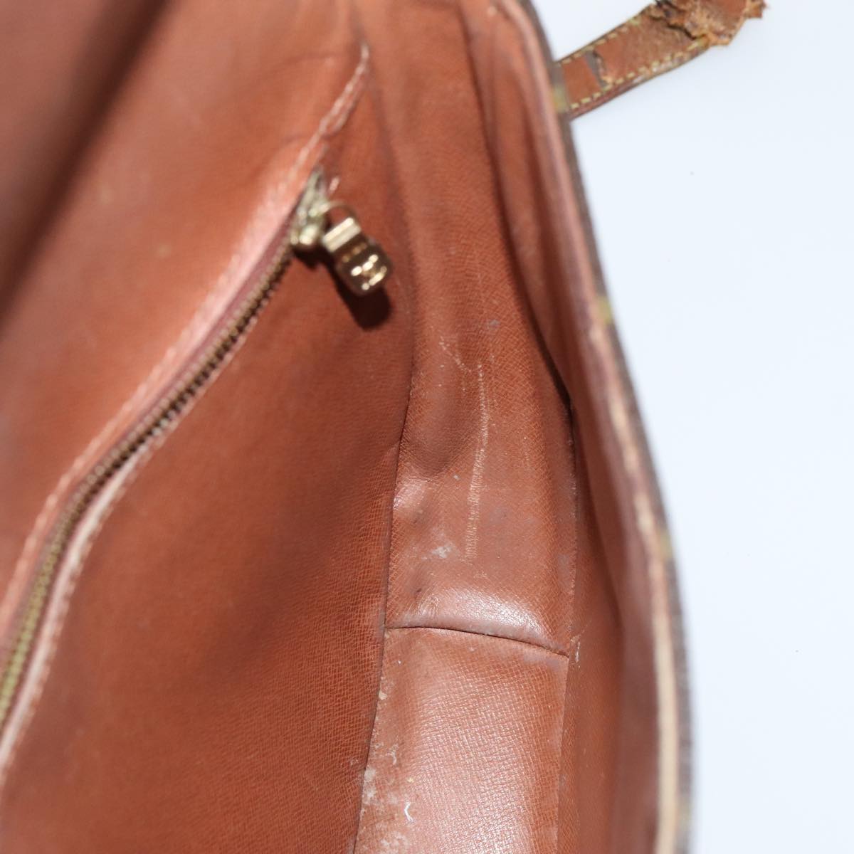 Surface:lose shape , rubbing , partly crack Leather:sun burn , rubbing , stain , scratches , crack Shoulder Strap:sun burn, rubbing, stain, deformation, scratches, crack, tear, torn off , partly thread fray Metal fittings:scratches , painting off |