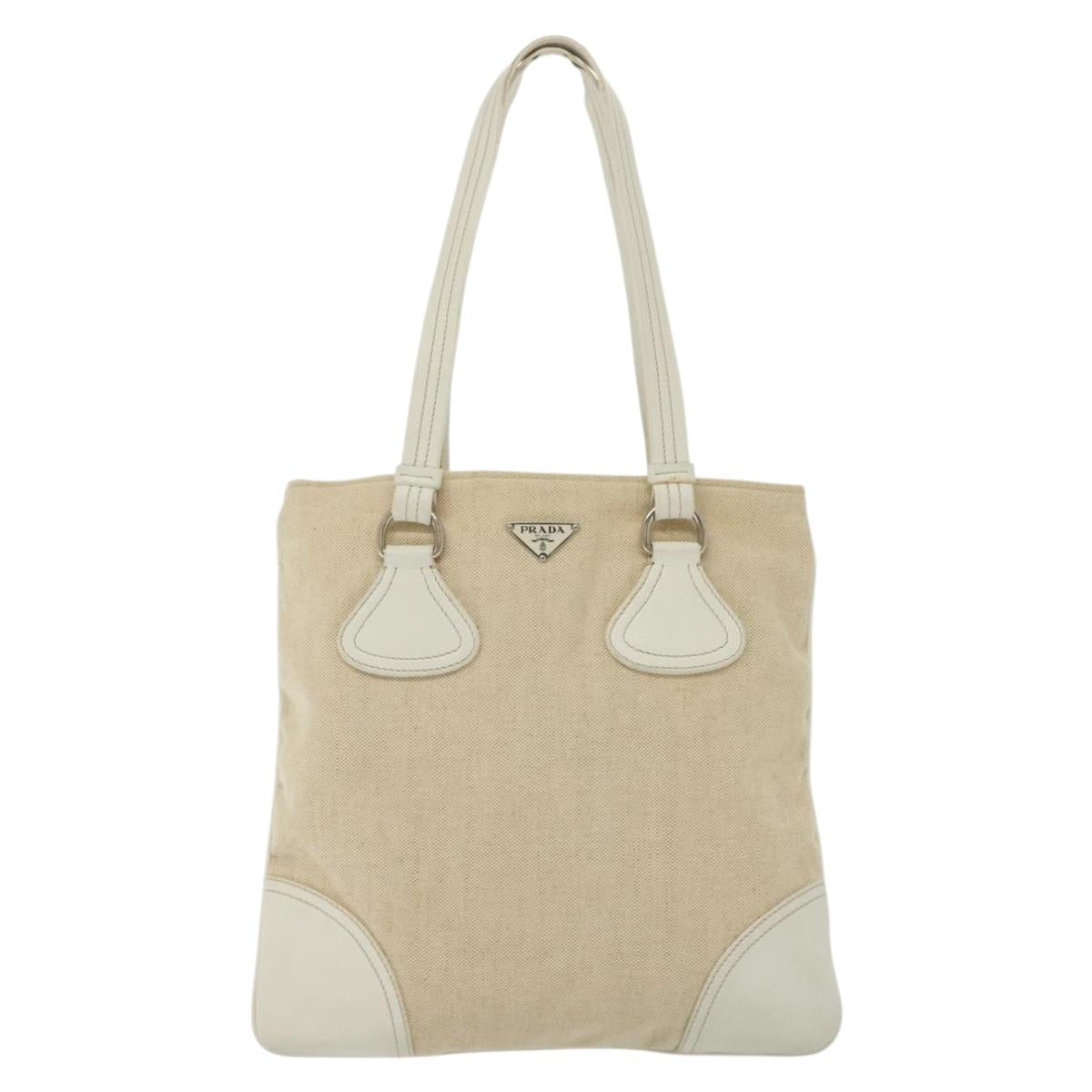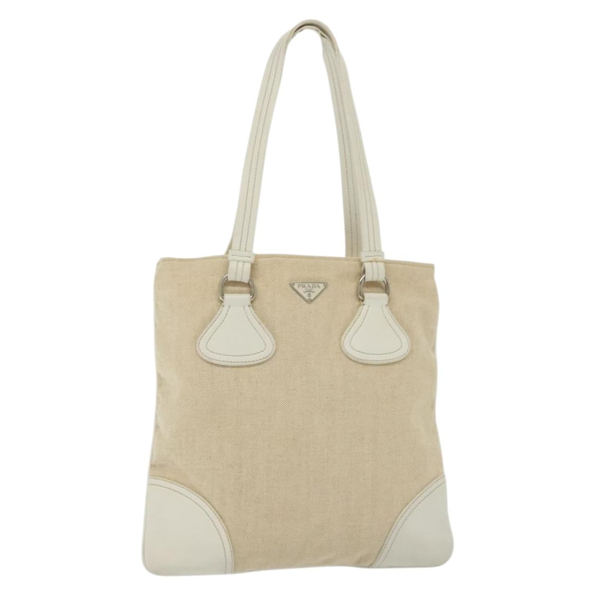 PRADA Tote Bag Canvas Beige Silver Auth 135047